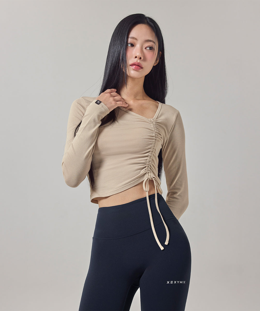 Unbalanced Neck Shirring Long Sleeve