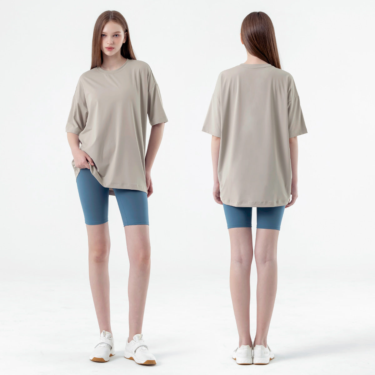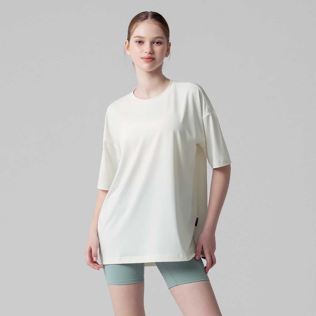 If you usually feel uncomfortable wearing leggings alone,try wearing them with the Ice Feather Overfit T-shirt. It will complete the burden-free leggings styling.