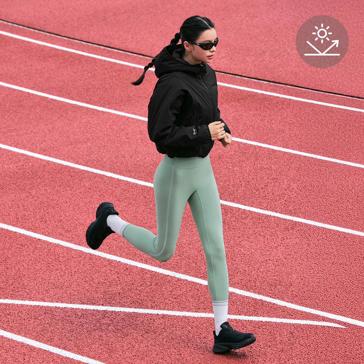 Reflective lettering along both calves and a running symbol logo at the back waist enhance visibility and add a refined finishing touch.